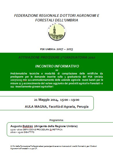 Si terrà il 21 Maggio 2014 dalle ore 15:00, presso l'Aula Magna della Facoltà di Agraria di Perugia, un INCONTRO FORMATIVO su PSR UMBRIA 2007-2013 - ATTIVAZIONE PROCEDURE 3° GRADUATORIA 2010 alla presenza del dott. Buldrini della Regione Umbria.