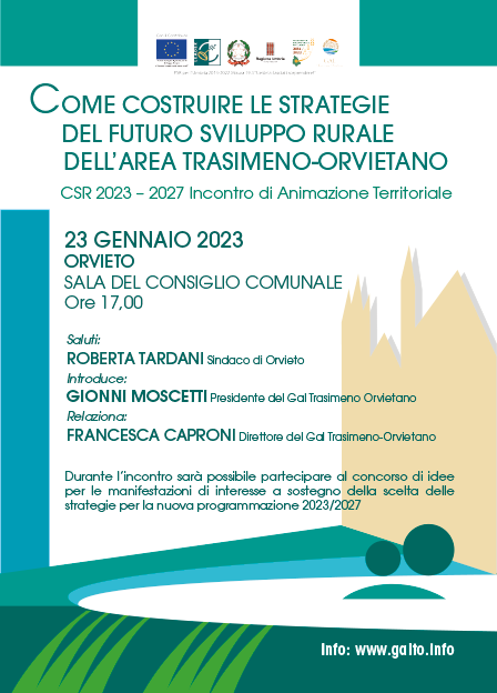Inizia la fase di animazione del territorio per il nuovo periodo di programmazione 2023-2027. La prima iniziativa lunedì prossimo ad Orvieto per coinvolgere i soggetti pubblici e privati e le pari economiche e sociali al fine di raccogliere opinioni, idee e suggerimenti per la formazione del nuovo piano di azione locale del Gal Trasimeno-Orvietano. Abbiamo aperto anche un concorso di idee attraverso il quale chiunque può fare pervenire suggerimenti, opinioni o proposte progettuali. Per informazioni il sito www.galto.info.