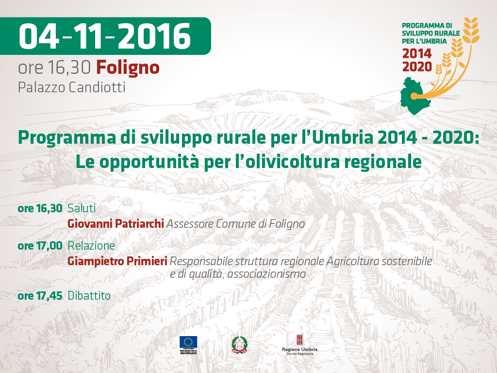 Con la presente siamo ad invitare, con preghiera di darne adeguata diffusione, all'incontro "PSR Umbria 2014-2020: Le opportunità per l'olivicoltura regionale" che si terrà Venerdì 4 novembre p.v. alle ore 16,30, nell'ambito di Autunno a Foligno, presso il Palazzo Candiotti.