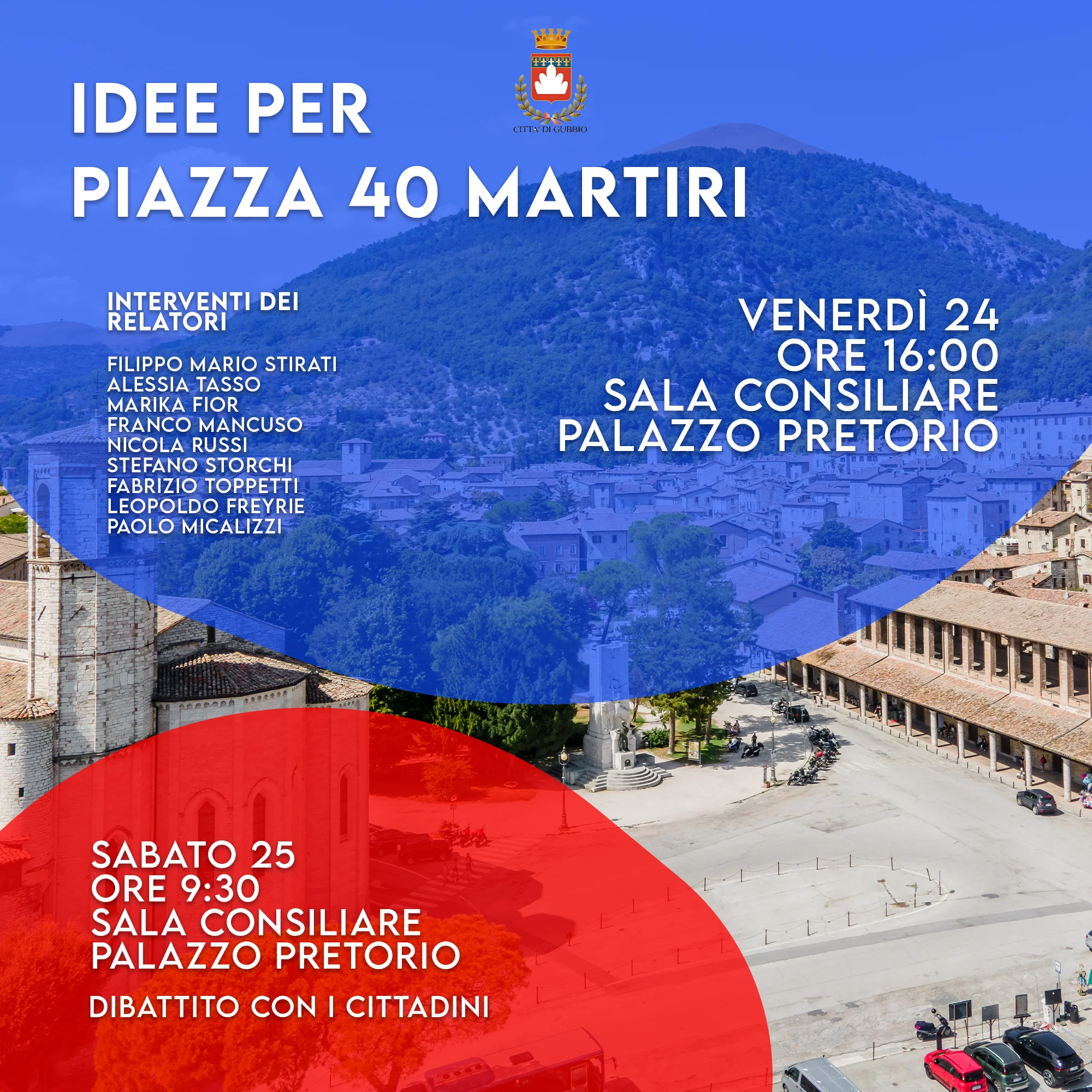 Il Sindaco di Gubbio Filippo Mario Stirati è lieto di invitarLa all'iniziativa "Idee per Piazza 40 Martiri" che si svolgerà venerdì 24 febbraio p.v. alle ore 16 e sabato 25 febbraio alle ore 9.30, presso la Sala Consiliare.