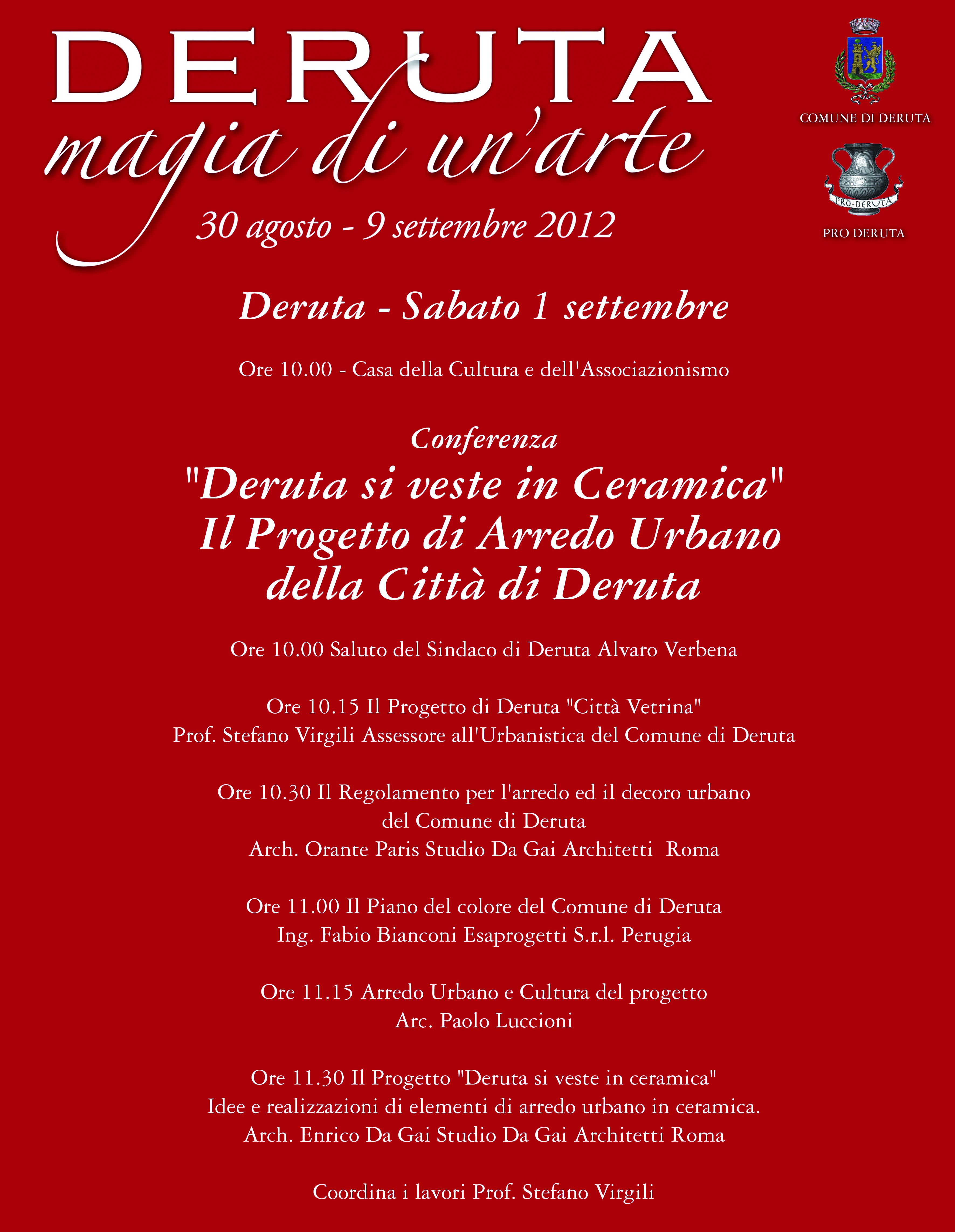 Si trasmette, in allegato, programma dell'evento: "Deruta si veste in Ceramica" - il progetto di Arredo Urbano della Città di Deruta inviatoci dal collega Dott. Stefano Virgili in programma dal 30 Agosto al 9 Settembre p.v..