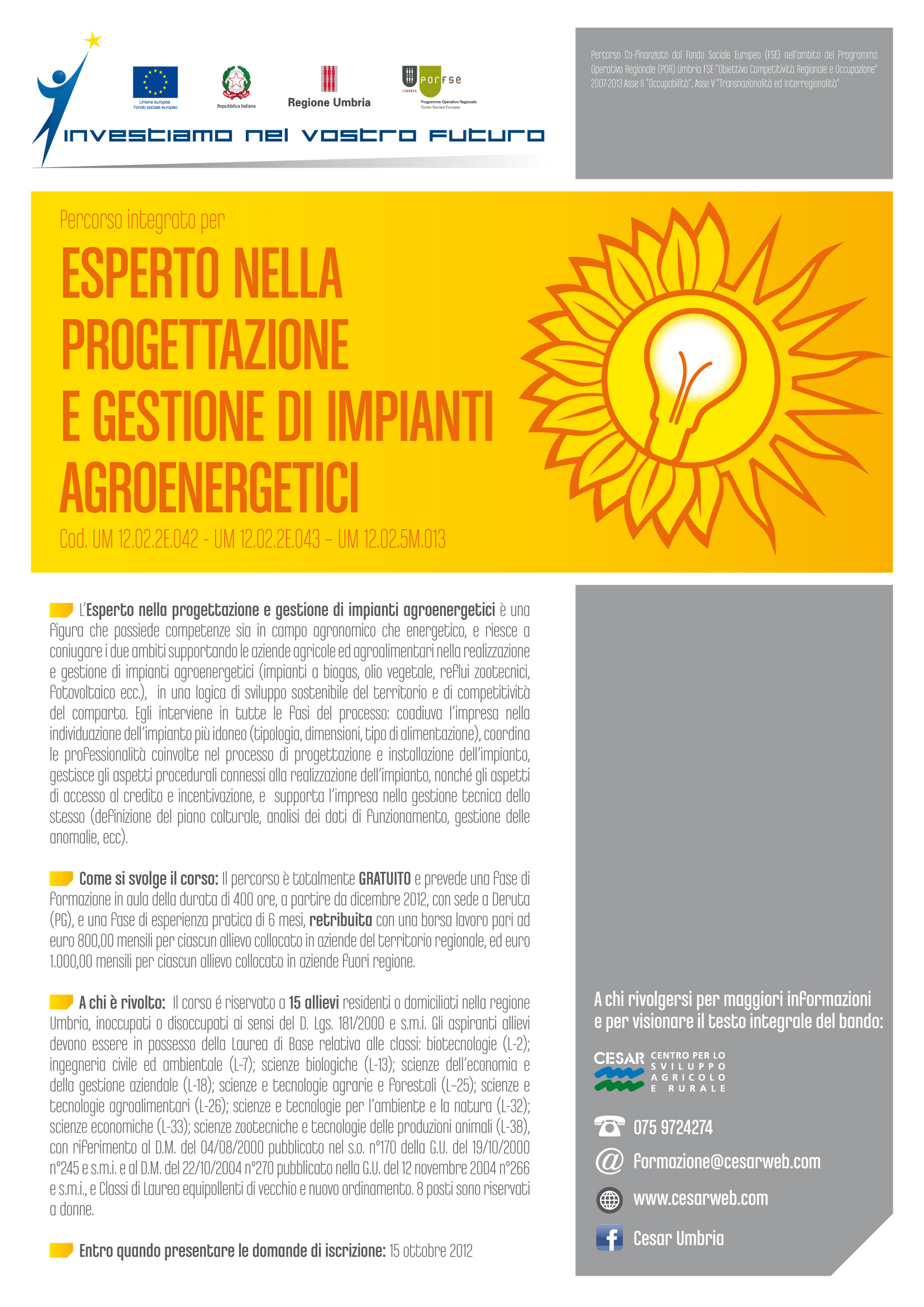 Sono aperte le iscrizioni al percorso integrato per per Esperto nella progettazione e gestione di impianti agroenergetici, progetto finanziato dal Fondo Sociale Europeo nell’ambito del Programma Operativo regionale (POR) Umbria FSE “Obiettivo Competitività Regionale e Occupazione” 2007-2013.