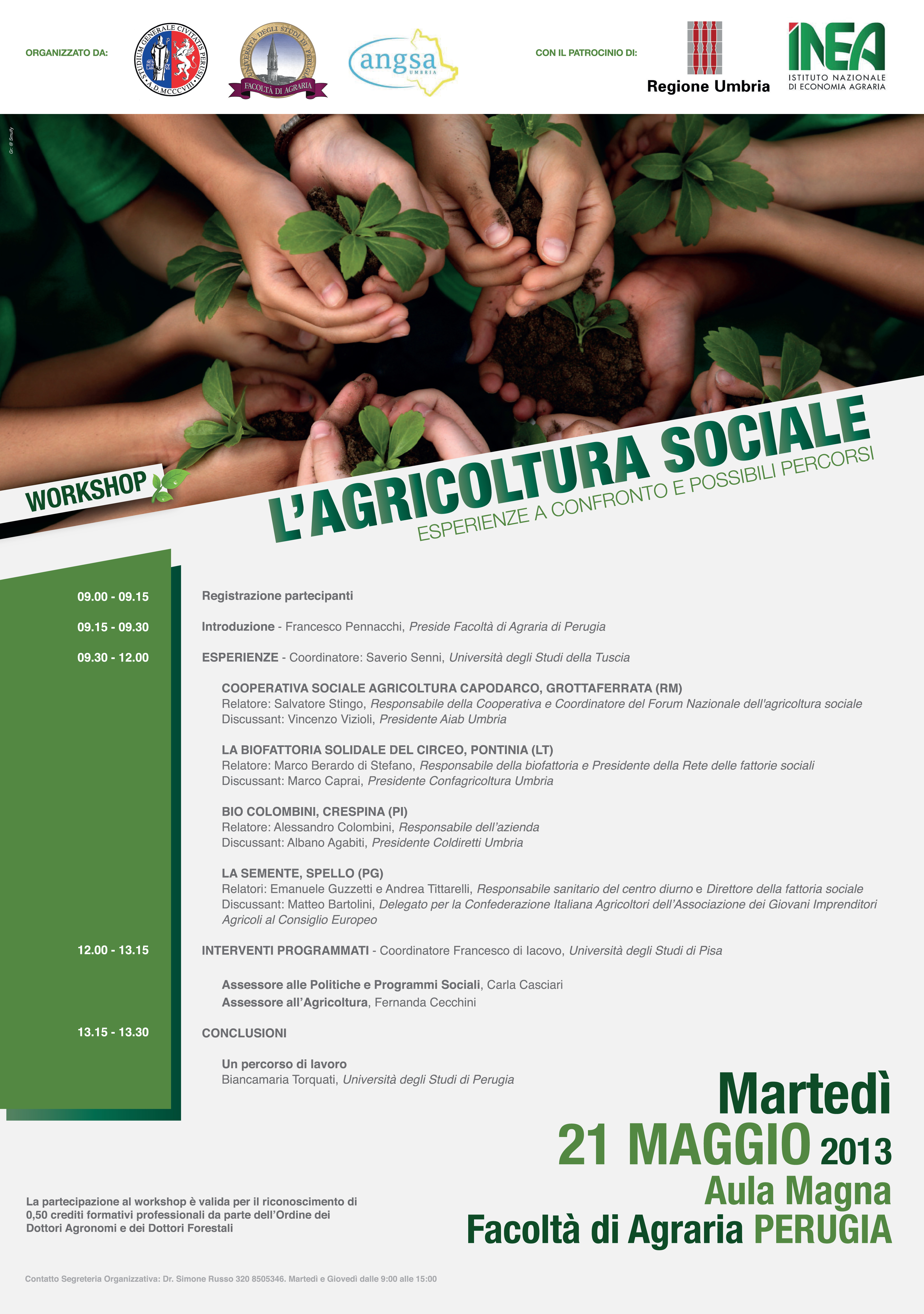 La Facoltà di Agraria di Perugia organizza per il giorno 21 maggio 2013, dalle ore 09,00 alle ore 13,30, il workshop "L'agricoltura sociale: esperienze a confronto e possibili percorsi" che si terrà in Aula Magna.