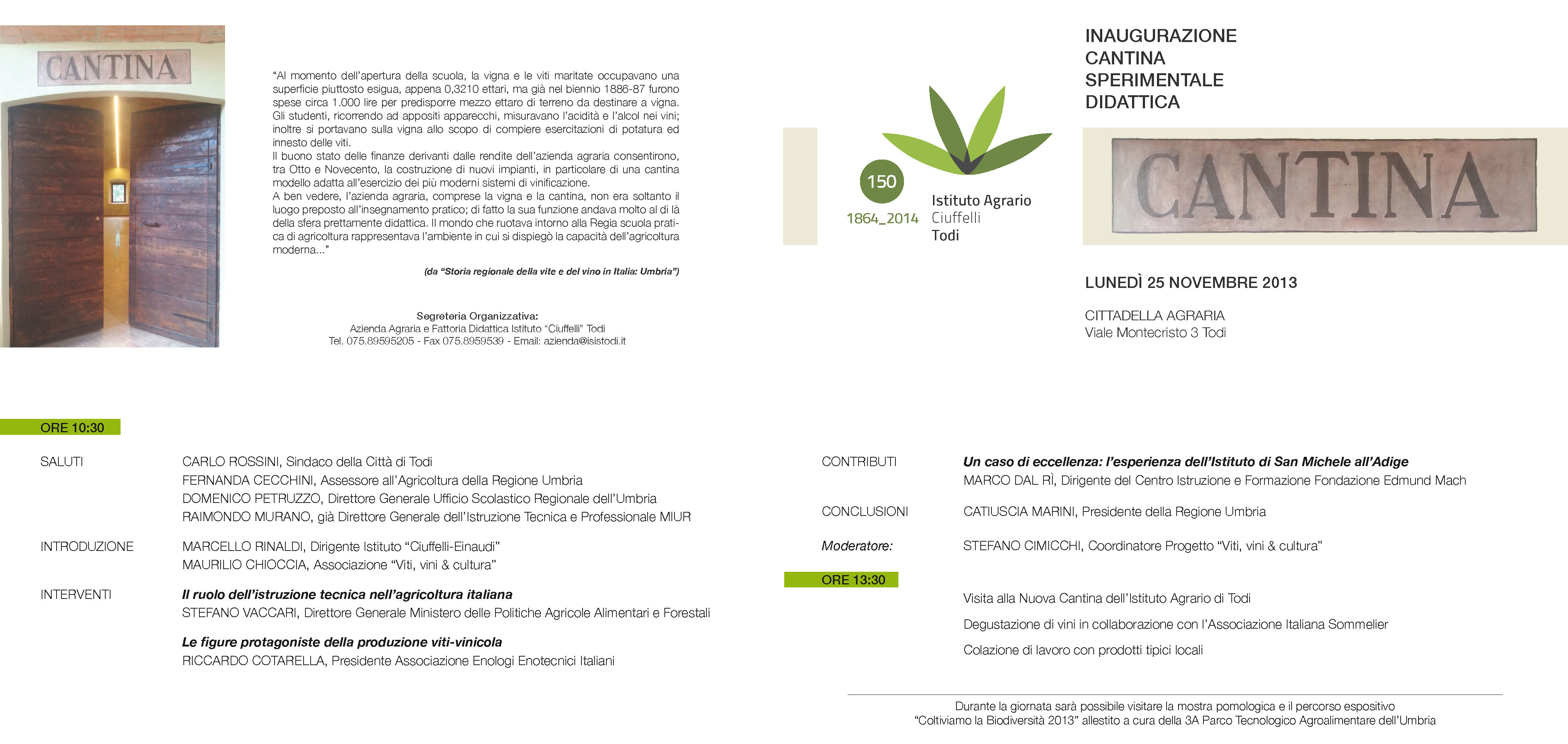 Lunedì 25 Novembre 2013, dalle ore 10:30 alle ore 13:30, si terrà presso l'Istituto Agrario di Todi, in Viale Montecristo 3, il Convegno di cui all'oggetto.L'evento si concluderà con la cerimonia di inaugurazione della nuova cantina sperimentale-didattica della "Cittadella Agraria".(vedi allegato)La partecipazione all'evento prevede l'assegnazione di 0,25 Crediti Formativi Professionali.Per informazioni contattare: