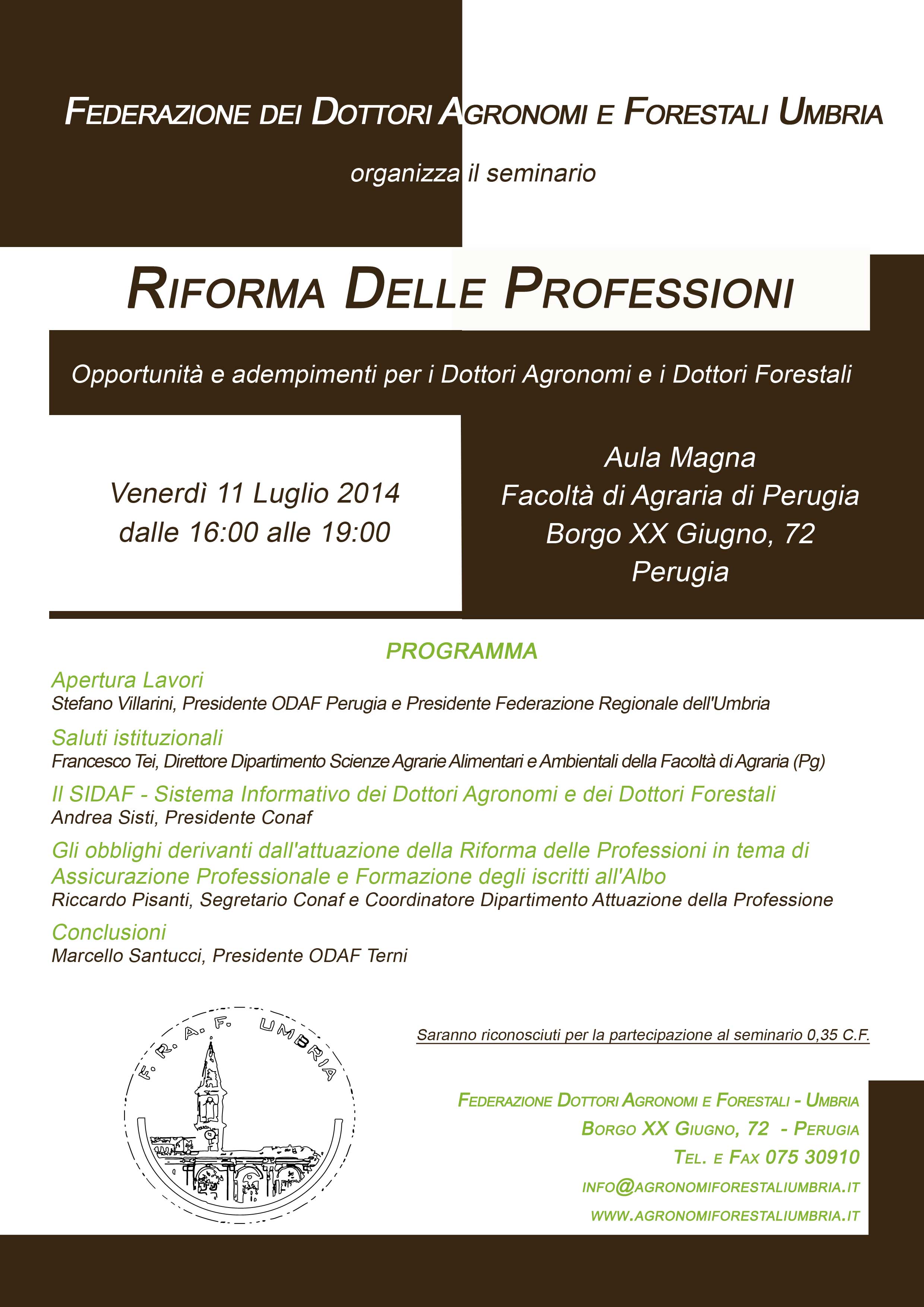 Si ricorda che è in programma il Seminario "Riforma delle Professioni - Opportunità e adempimenti per i Dottori Agronomi e i Dottori Forestali" al quale parteciperanno il Presidente nazionale Dott. Andrea Sisti ed il Consigliere Segretario Conaf Dott. Riccardo Pisanti.