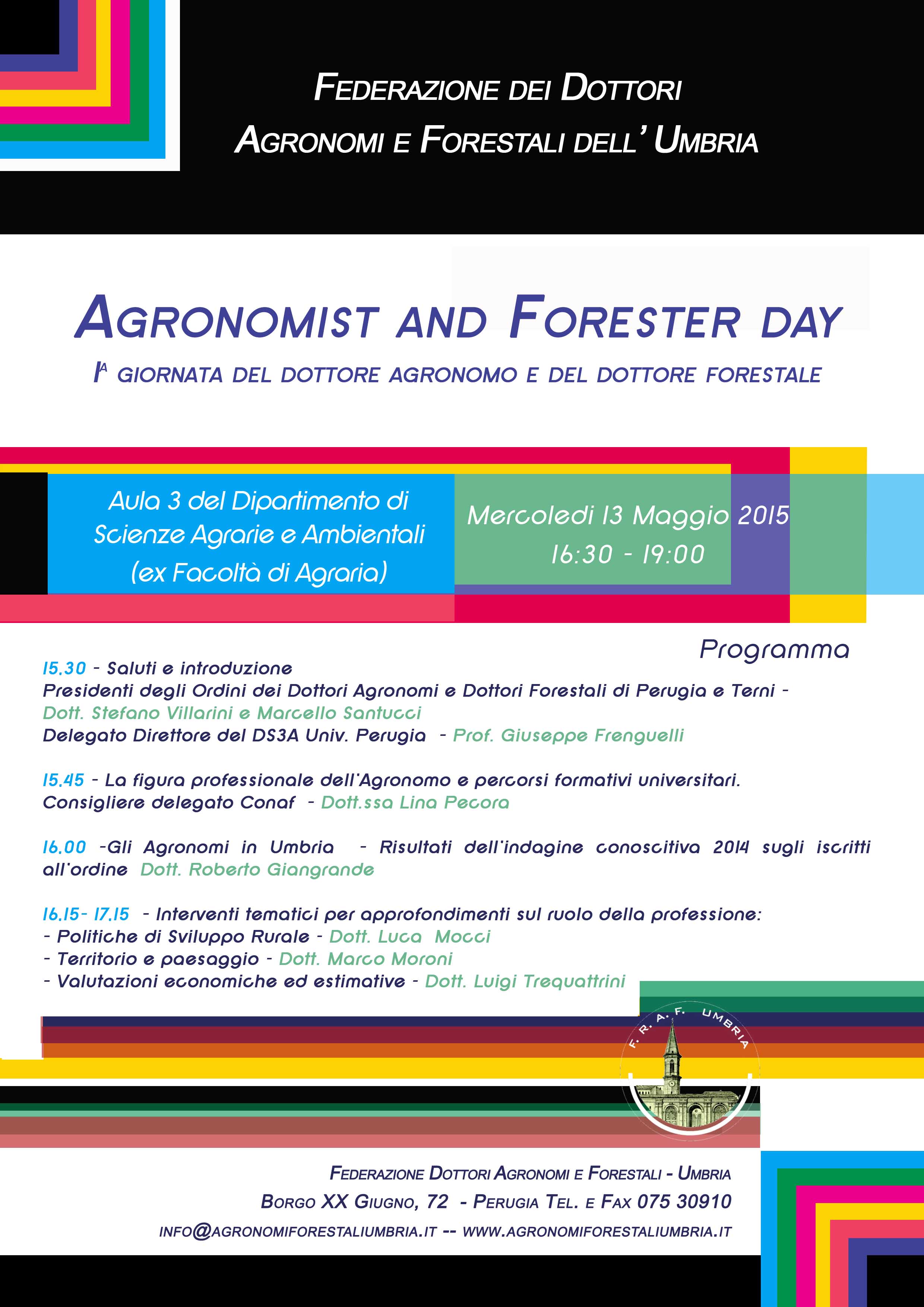 si svolgerà in data 13 maggio 2015 dalle ore 15,30 presso il Dipartimento di Scienze Agrarie e Ambientali il primo appuntamento tra i Dottori Agronomi e studenti della ex Facoltà di Agraria per far conoscere la Ns. professione, le Ns. competenze e le peculiarità delle attività del Dottore Agronomo e Dottore Forestale.