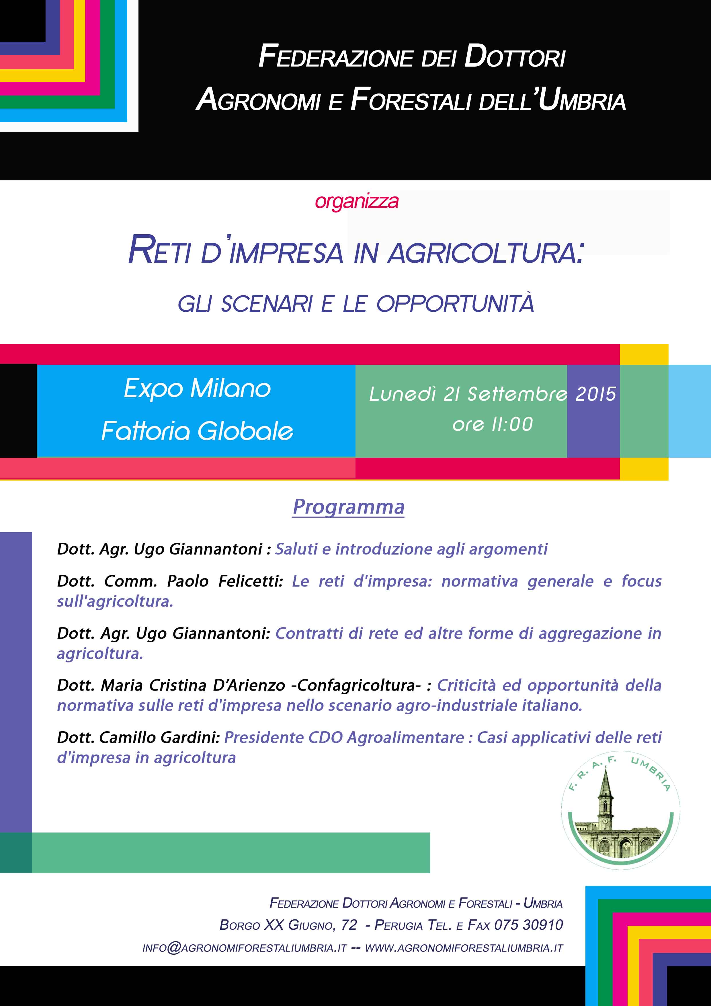 Ad EXPO Milano si terrà il prossimo 21 settembre alle ore 11:00 il Seminario RETI DIMPRESA IN AGRICOLTURA