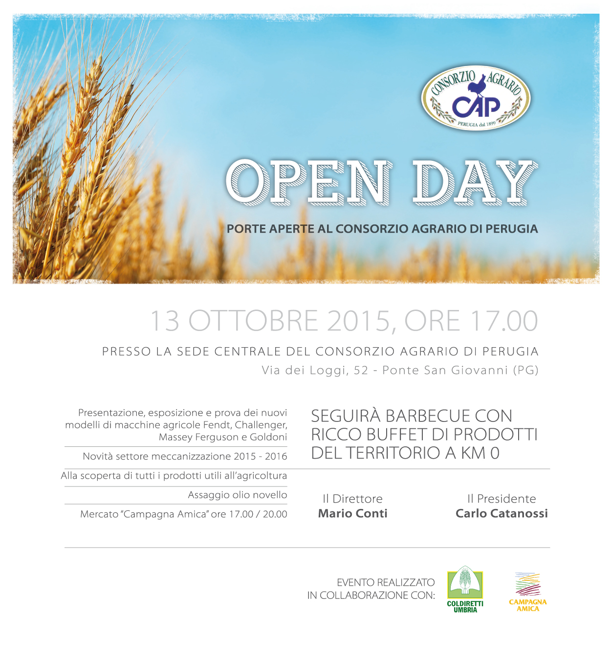 abbiamo il piacere di invitarla al II evento “Open Day – Porte aperte al Consorzio Agrario di Perugia” che avrà luogo il giorno 13 ottobre 2015, come da invito allegato.