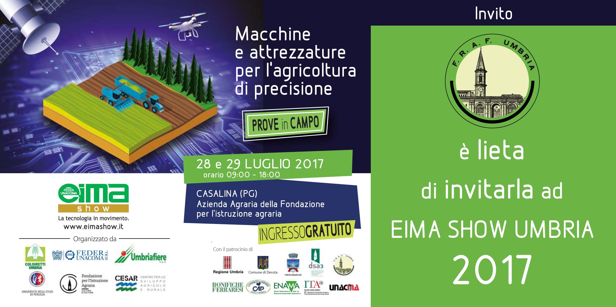 La Federazione dei Dottori Agronomi e Dottori Forestali dell’Umbria è lieta di invitarla a EIMA Show 2017 che si terrà il 28 e 29 luglio 2017 presso l’azienda agraria della Fondazione per l’Istruzione Agraria di Casalina di Deruta (PG). Evento dedicato alla dimostrazione dal vivo di macchine ed attrezzature per l’agricoltura di precisione.